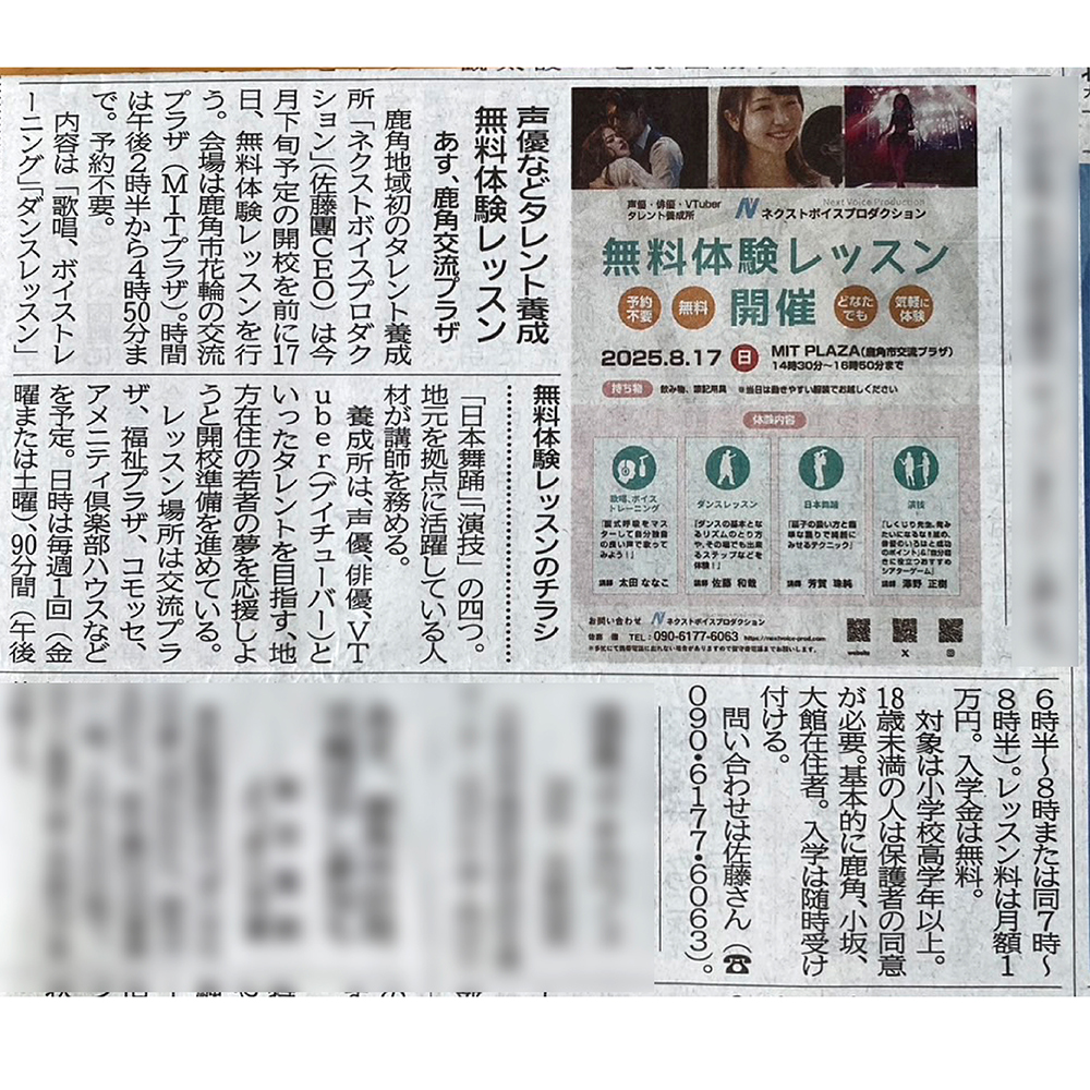 北鹿新聞に明日の無料体験レッスンの件が掲載されました!